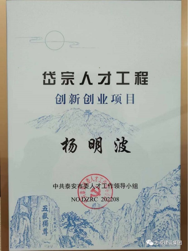 k8凯发集团山东铁鹰建设工程有限公司董事长杨明波同志凭借其卓越的创新成果和创业成就,成功通过了泰安市岱宗人才工程创新创业项目的评审!本项目全市共8人通过评审,岱岳区仅杨明波同志1人通过。